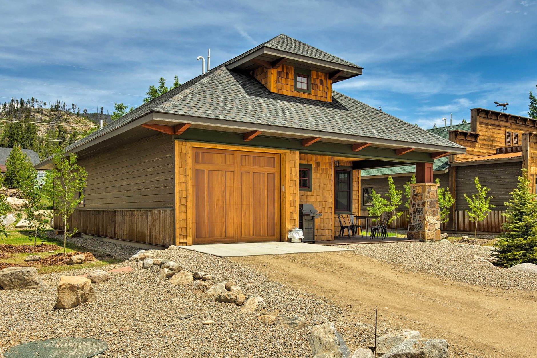 STEP OUTSIDE: Covered front porch w/ outdoor dining table, lighting & gas grill, mountain & lake views
